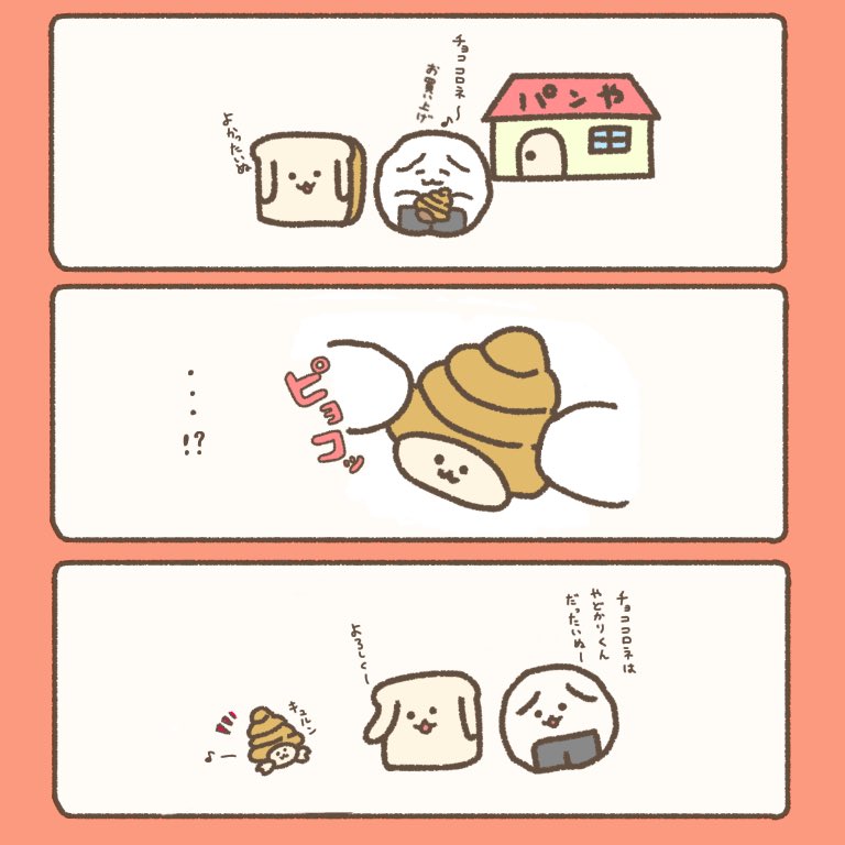 チョココロネのやどかりくん?? よろしくいぬ!!おにぎりわんこゆるいイラストやどかりチョココロネ3コマ。