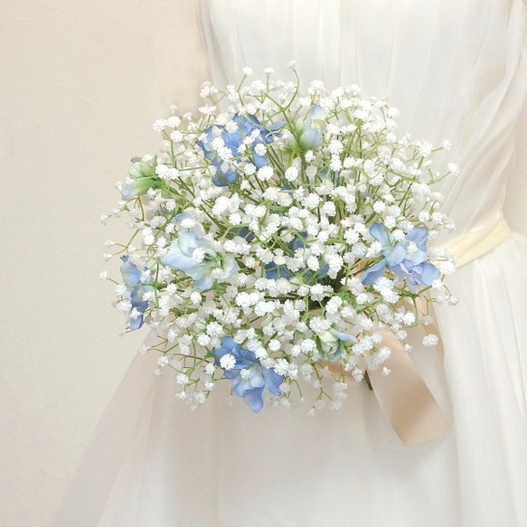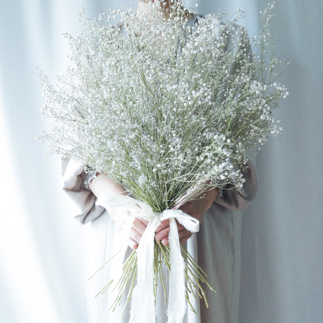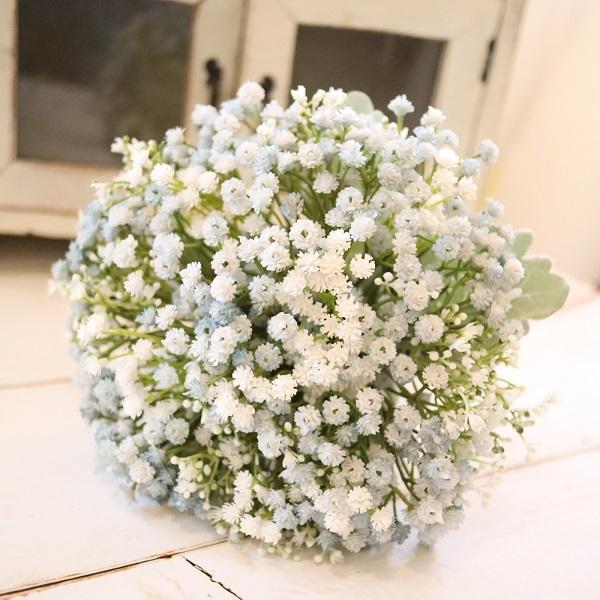 ペールなブルー 清楚なカスミソウのブーケ ナチュラル 草花 かすみ草 海外 前撮り かすみ。