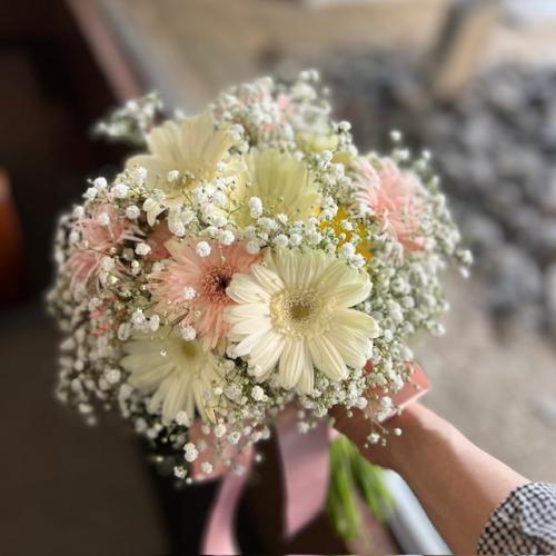INFINITYかすみ草とガーベラのクラッチブーケ11白桃。