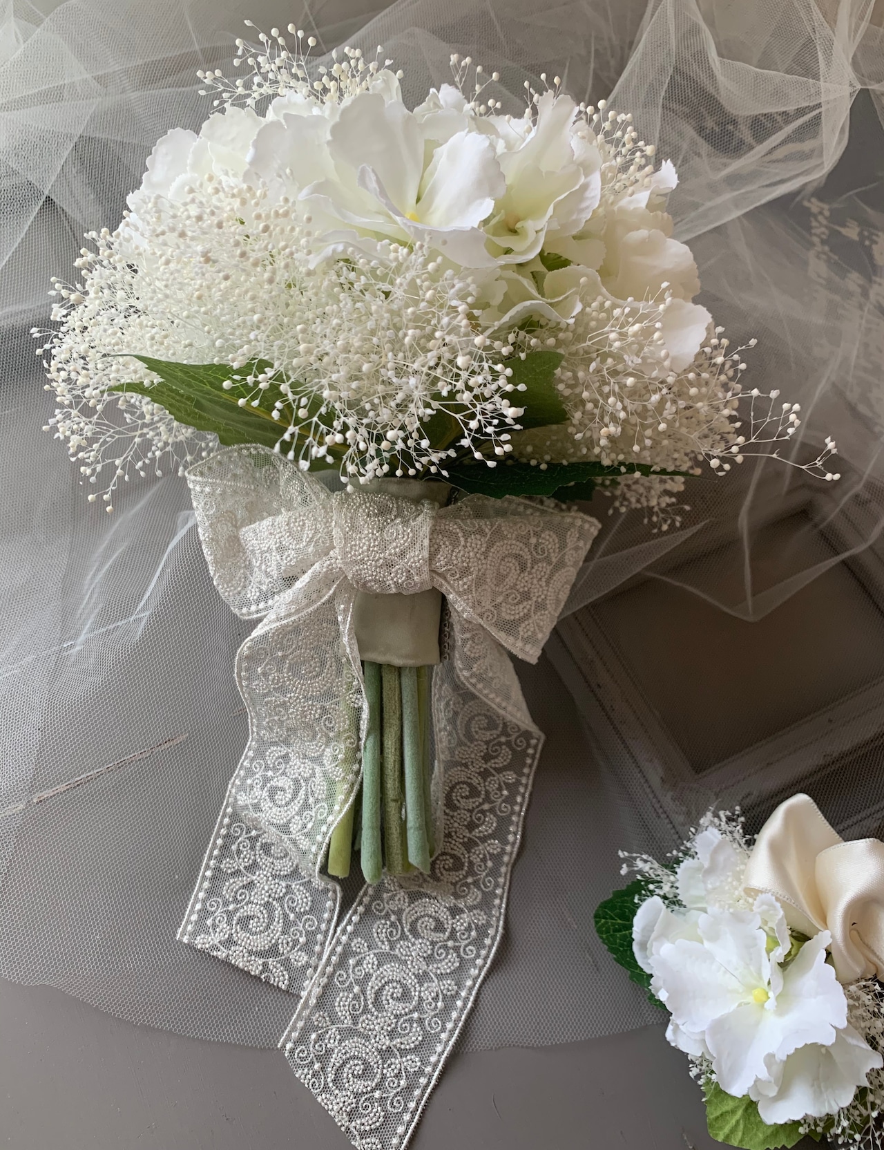 ホワイトアジサイとかすみ草のウエディングブーケ ブートニア付き 20cmアトリエ biora。