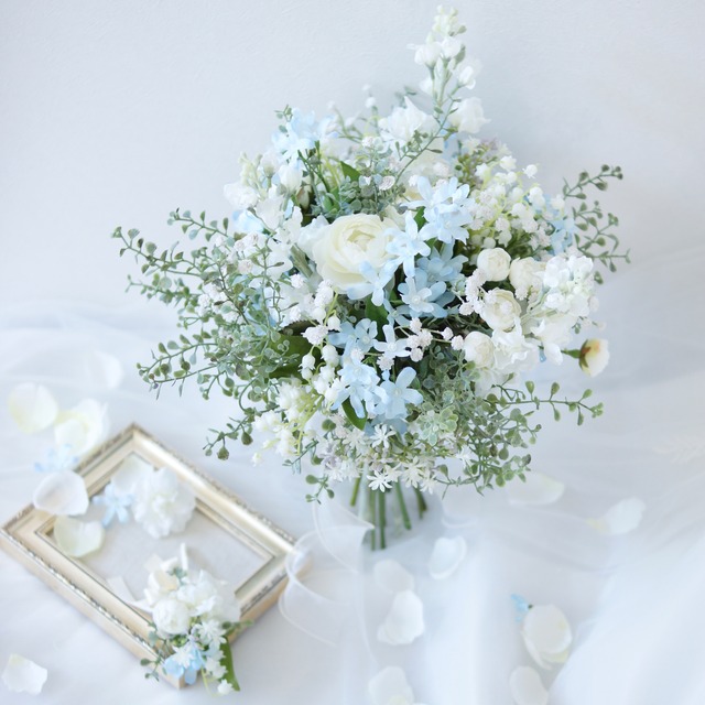 受注制作 Something Blue かすみ草とブルーデルフィニュームのクラッチブーケ&ブートニアセット。