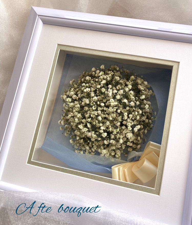 かすみ草ブーケの保存 シンプルなホワイトフレームにリボンやラッピングもプラスして – 岐阜県可児市ブーケ 保存加工専門店『hanakanzashi 花かんざし 』。