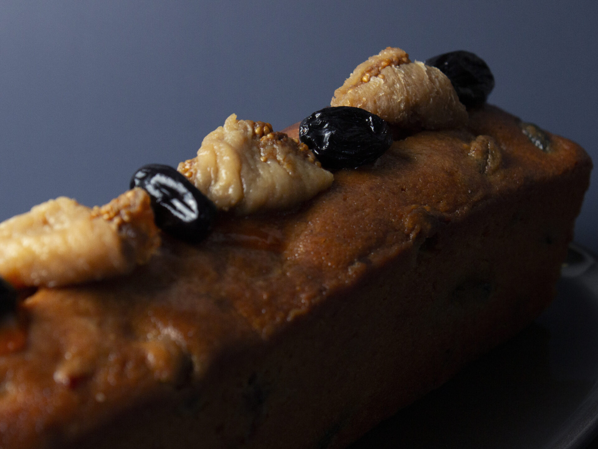 コニャックグレーズを添えたイチジクとオリーブオイルのケーキ。