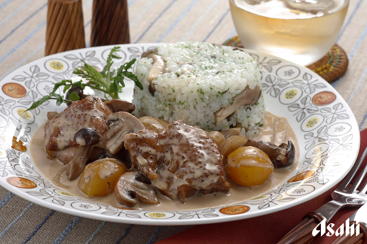 プーレ・オ・コニャック チキンのブランデー煮 キノコライス添えのレシピ・作り方おつまみレシピアサヒビール。