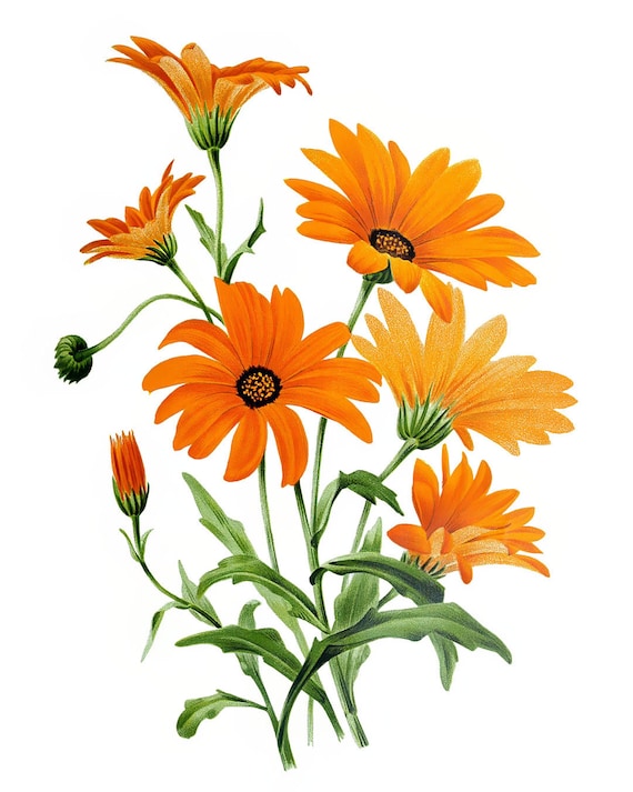 オレンジ色の花、アフリカンデイジーのデジタルプリント、ヴィンテージフラワーイラスト、印刷可能なデイジー、ボタニカルウォールアート、即時ダウンロード -Etsy 日本。