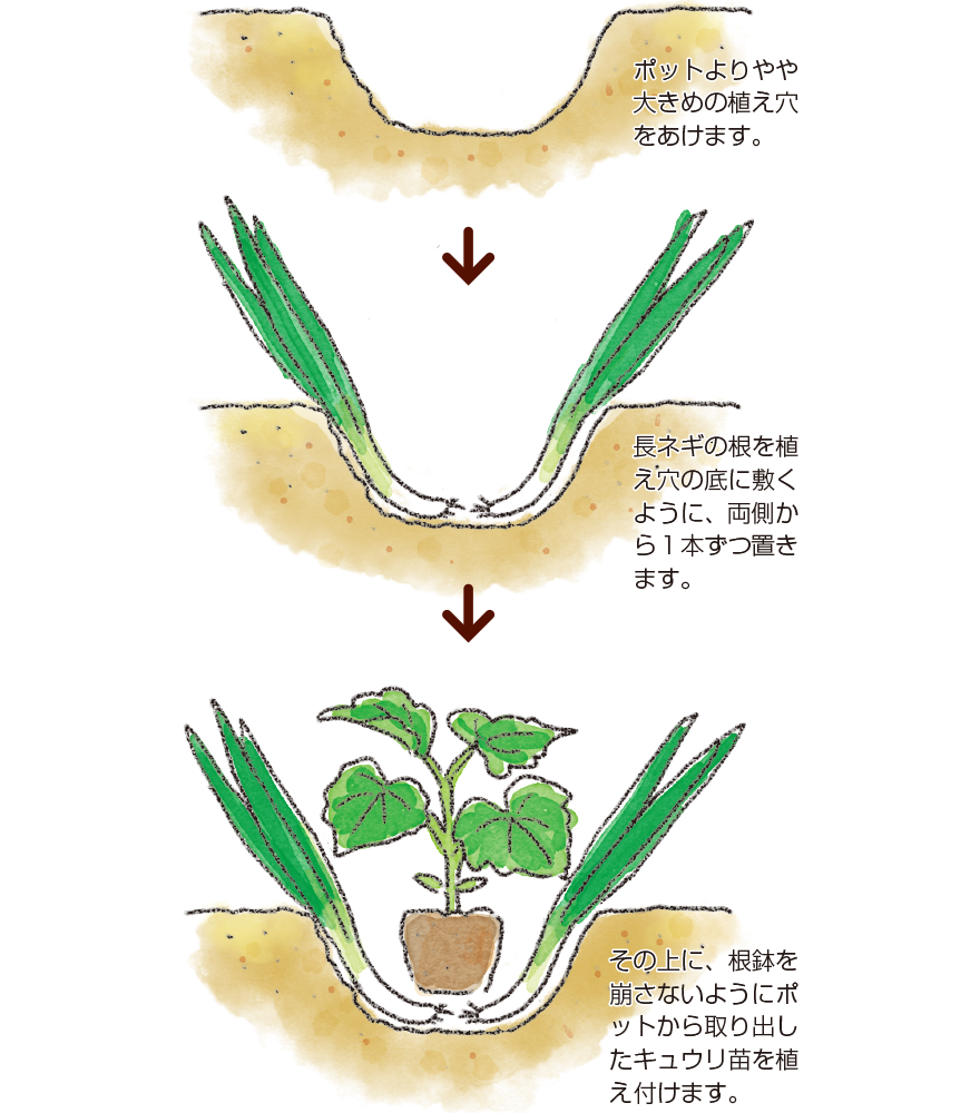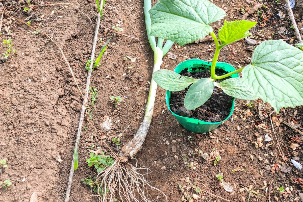 4月中に覚えたいキュウリを丈夫に育てる裏技!?ネギを一緒に植えて病気予防!?混植栽培・夏野菜・苗の植え付けが楽しくなる方法 家庭菜園コンパニオンプランツつる割れ病ネギ。
