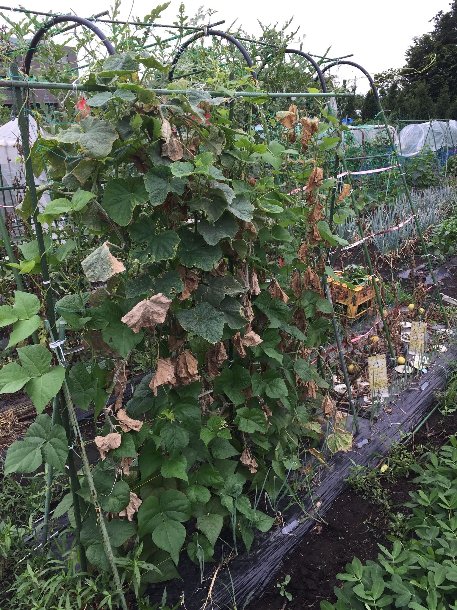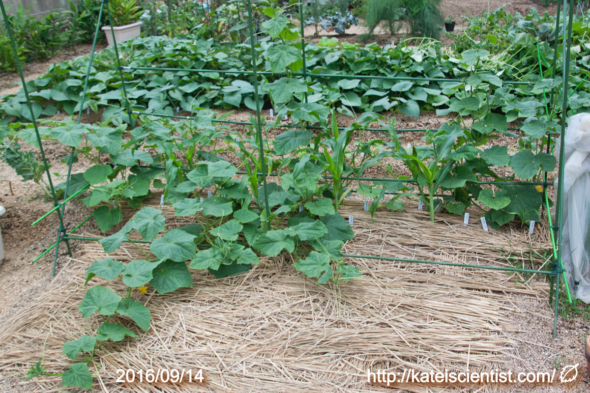 試験中 「トウモロコシ × キュウリ カボチャ 」 コンパニオンプランツ - 家庭菜園ティスト家庭菜園ティスト。