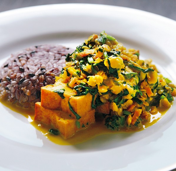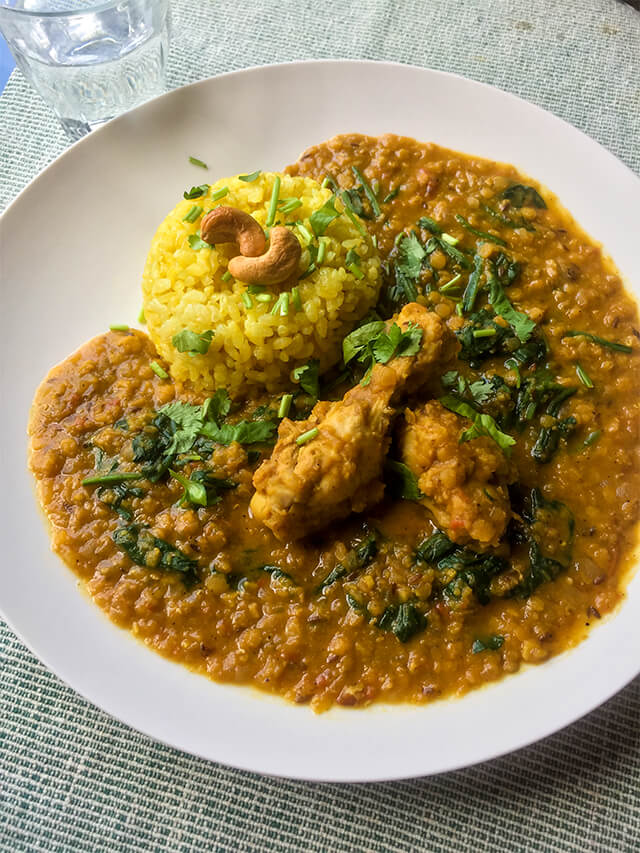 ほうれん草とレンズ豆のカレー, イエローライス添え。