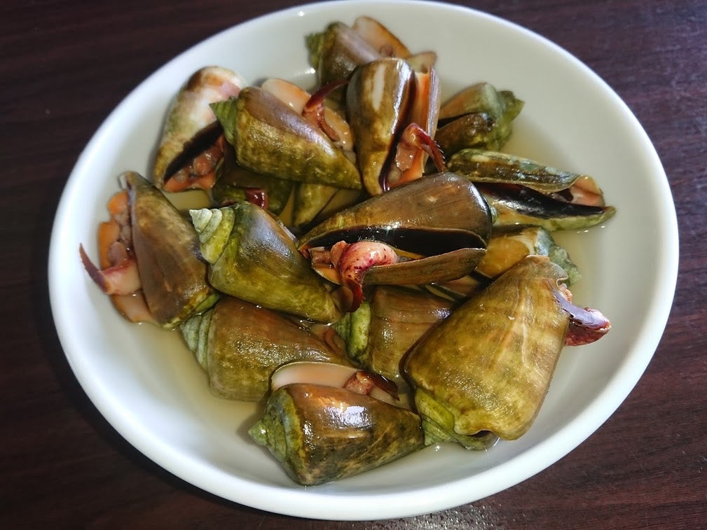 ミナって言ったり、ビナって言ったり。    ミナ拾って茹でて頂きました😃💕。   塩ゆでして、まち針📍で貝の蓋と身の間に差し込んで、クルクルっと上手に引っぱりだすと最後まで身が出てきます。  珍味でなじみの味🎵。   天草好きの皆さん、フォロー。