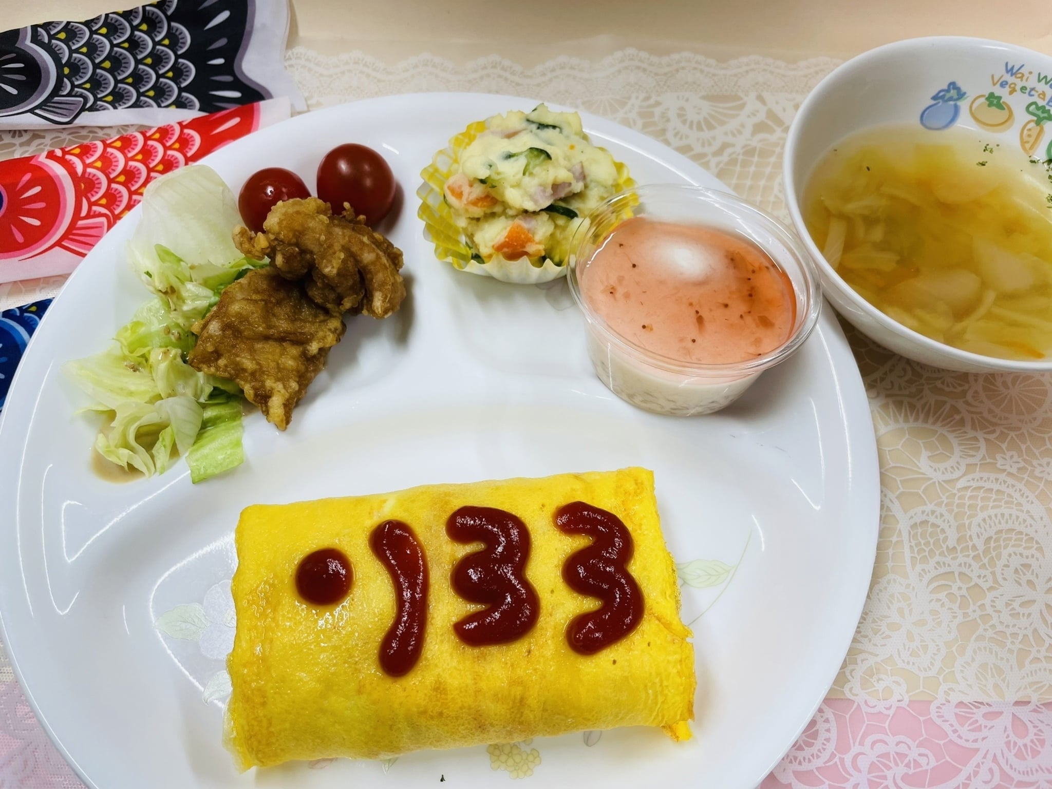 こどもの日&お誕生日メニュー🎂✨ 鯉のぼりオムライス🎏 大きなお口でいっぱい食べてくれる子どもたち💖💖こどもの日は子どもたちの健康と幸福を願う日🌟 5月2日のおやつには柏餅を提供します😆東野こども園認定こども園京都市こども園山科区こども園京都市。