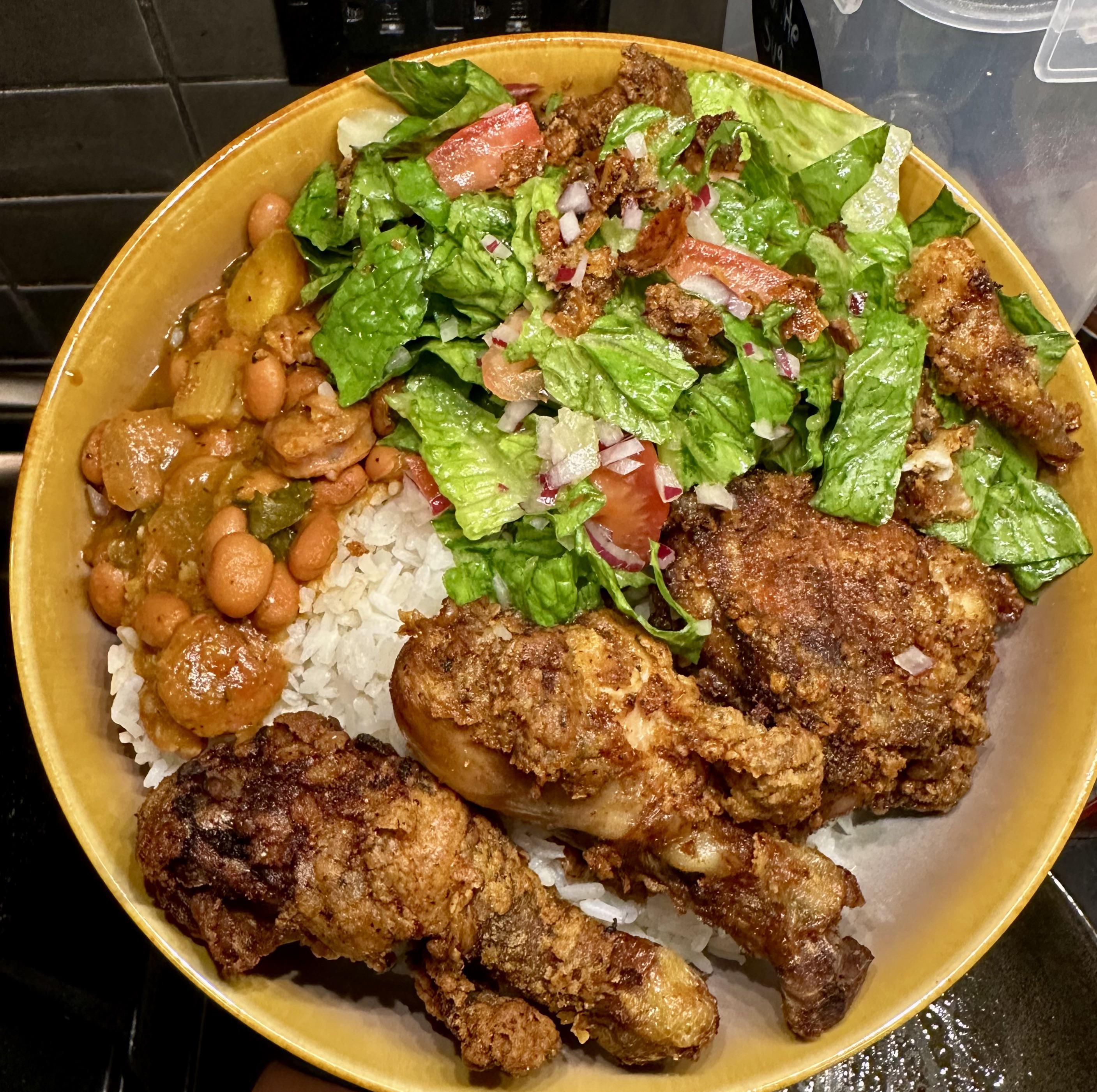 フライドチキン、ご飯、豆、サラダ。 : r FoodPorn。