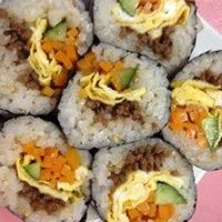 レシピ画像付キンパ 韓国風海苔巻き 作りました✨ 卵焼き焼くのは面倒だったので、 具材はシンプルにタレに漬け込み焼いた牛肉と 茹でたほうれん草と 人参ナムルのみ! とっても美味しかったです🥰 . 本当は具沢山にしたかったのですが、 具が多いと巻くのが難しくて。