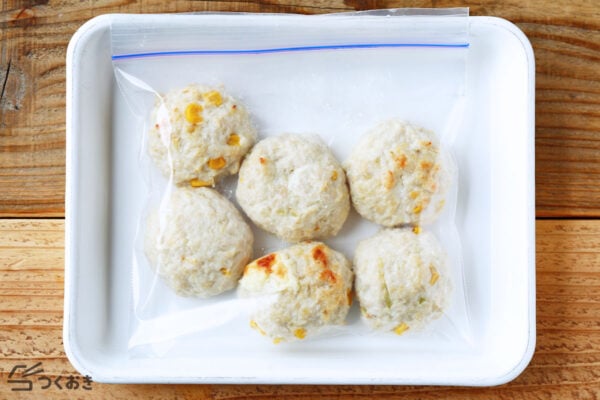 みーちゃんのごはん🍴♡離乳食→幼児食♡10分で出来る はんぺんボール袋で混ぜて丸めて焼くだけ。食材 約10個分 はんぺん1枚 蒸し海老20g コーン20g 片栗粉 小さじ1 代わりに枝豆を入れる場合は半分か1 3くらいに切ってから🫛 * ① 袋の中で全部入れてよく。