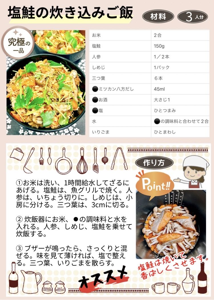 鮭の炊き込みご飯と肉じゃが献立見た目も美味しい彩り豊かなメニューをご紹介いたします健康のためのレシピ探しならママンクッキングサービス。