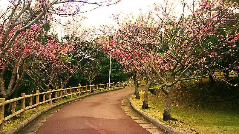 沖縄・嘉数高台公園のピンク色の寒緋桜つるの部屋。