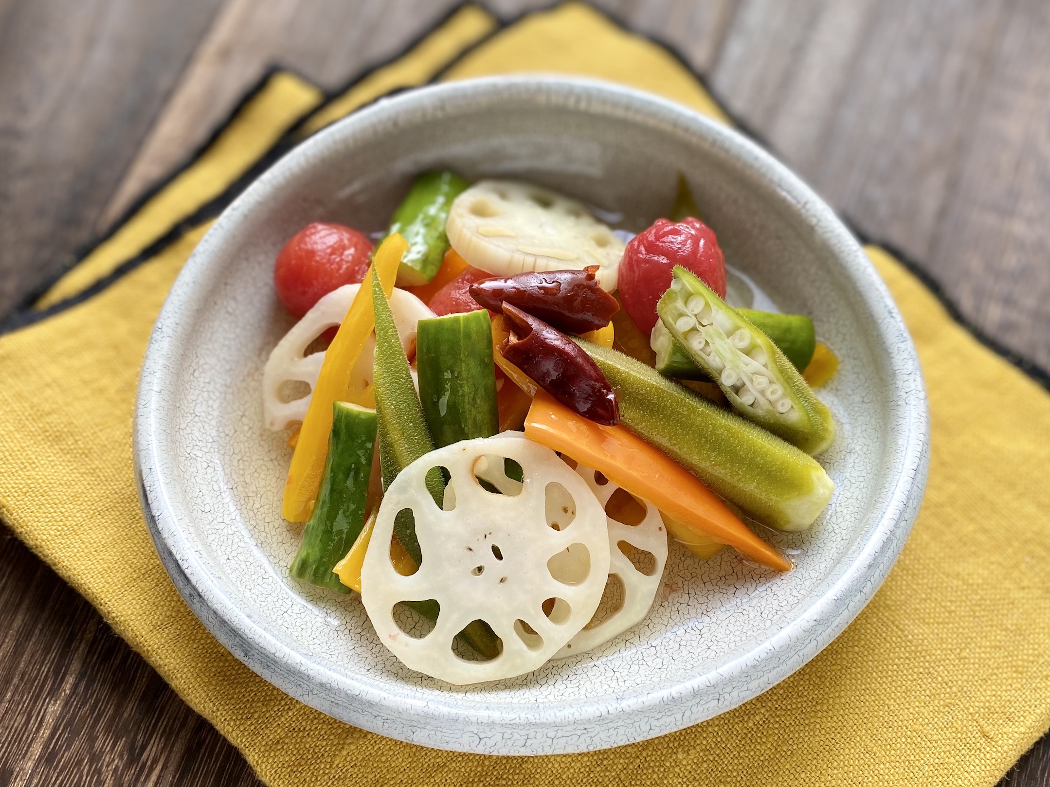 玉ねぎドレッシングでさっぱり!トビウオと野菜のグリルサラダ。
