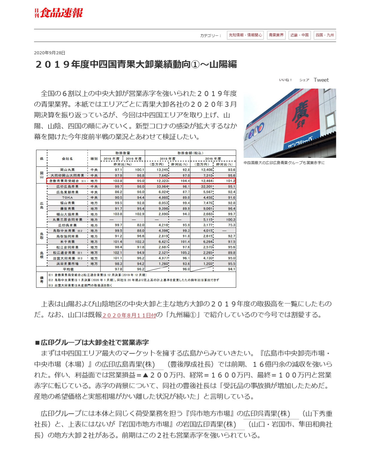 日刊 食品速報に掲載されましたクラカグループ 倉敷青果株式会社。