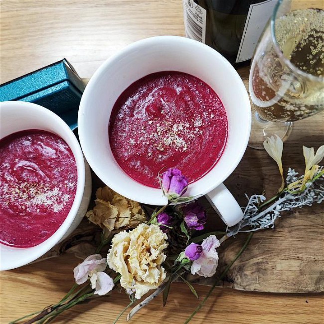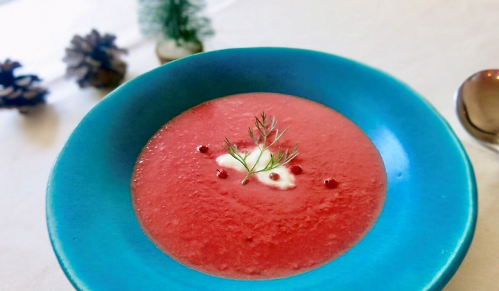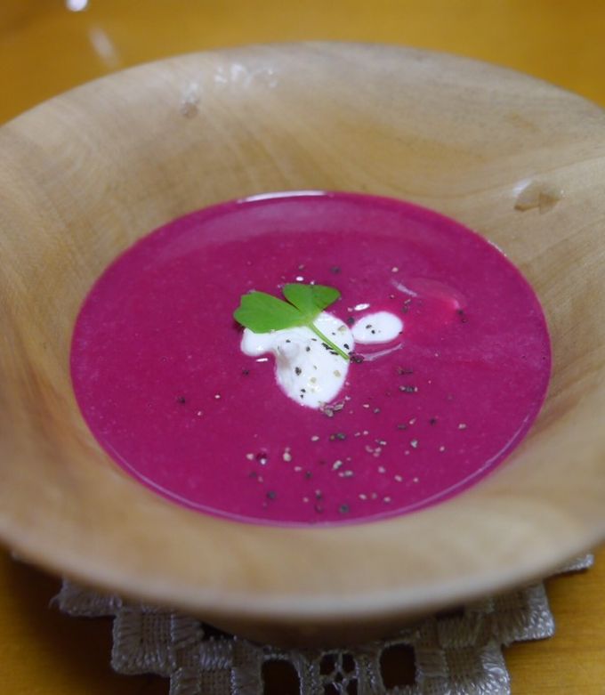 テーブル華やぐ、ビーツとベーコンのポタージュ。