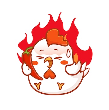辛い顔のかわいい鶏肉を高レベルの辛い食べ物を食べて燃える火のイラストPremiumベクトル素材。