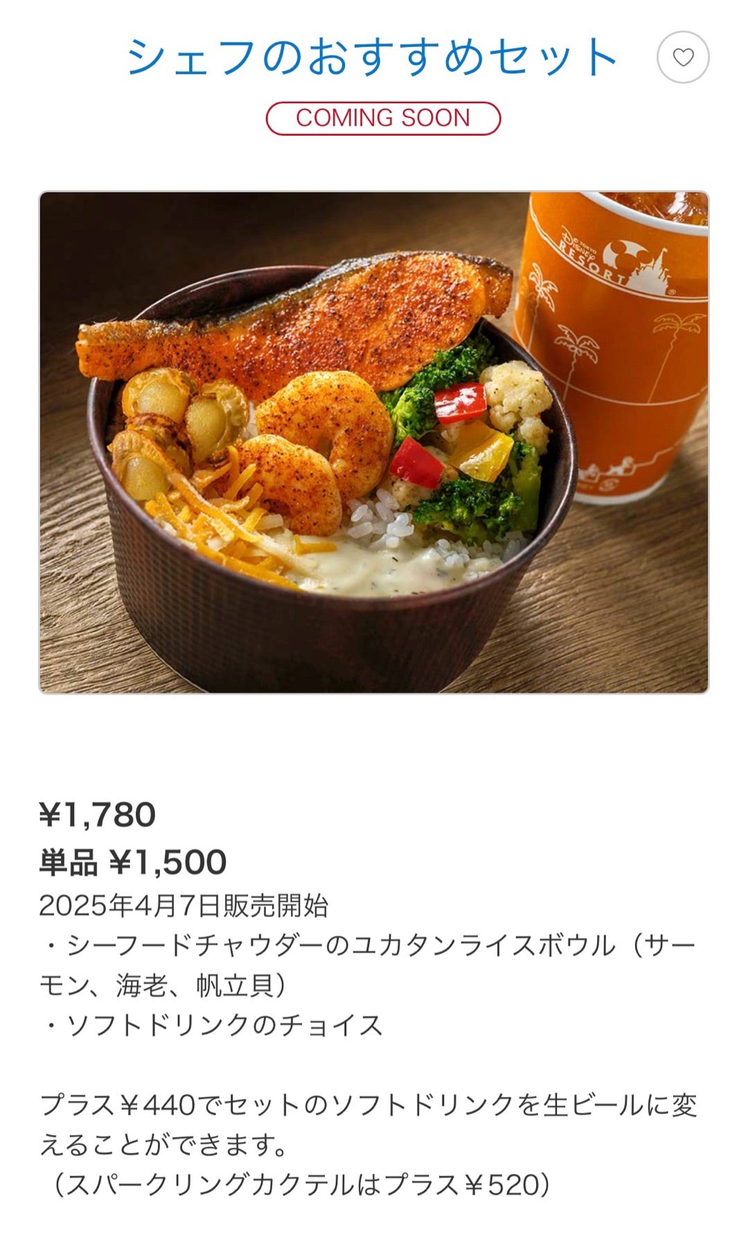ディズニーシー新メニュー情報🤩4 7 月 ユカタンベースキャンプグリルにて販売開始😍ハッシュドビーフのユカタンライスボウル 骨付きチキン、ベーコン、エッグ 単品¥1,300ソフトドリンクセット¥1,580です、詳しくは次のページをどうぞ!画像は東京ディズニーリゾート。