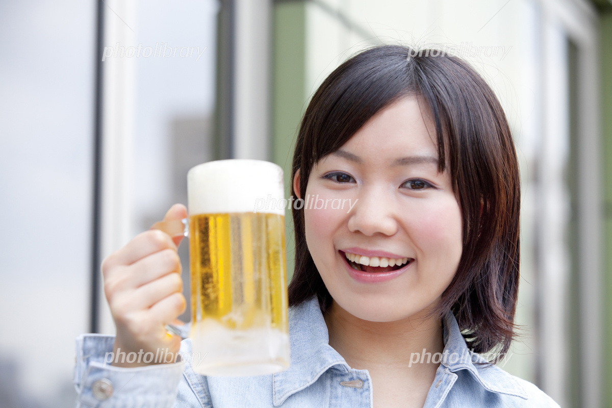 ビールを持ち笑顔の若い日本人女性12098857 の写真素材 - アフロ。