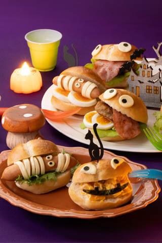 ハロウィンランチレシピもうすぐハロウィン🎃 バターロールで簡単ハロウィンランチはいかがですか? お好きな具材を用意したら挟むだけ可愛いモンスターパンの完成👻⚡️ ぜひお試しください。Olympicパン工房ハロウィンパンハロウィンランチモンスターパン。