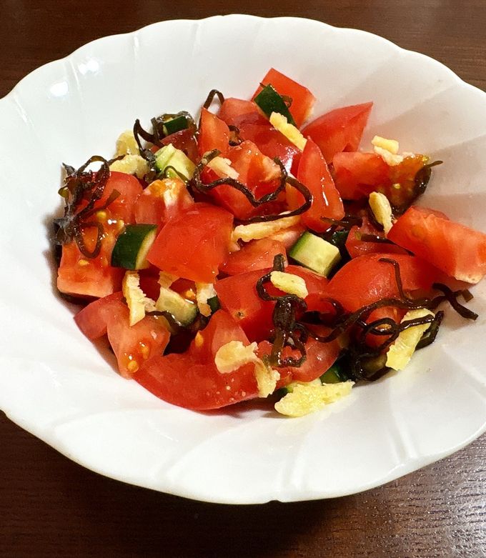 *トマトときゅうりと香味野菜の塩昆布サラダ*。