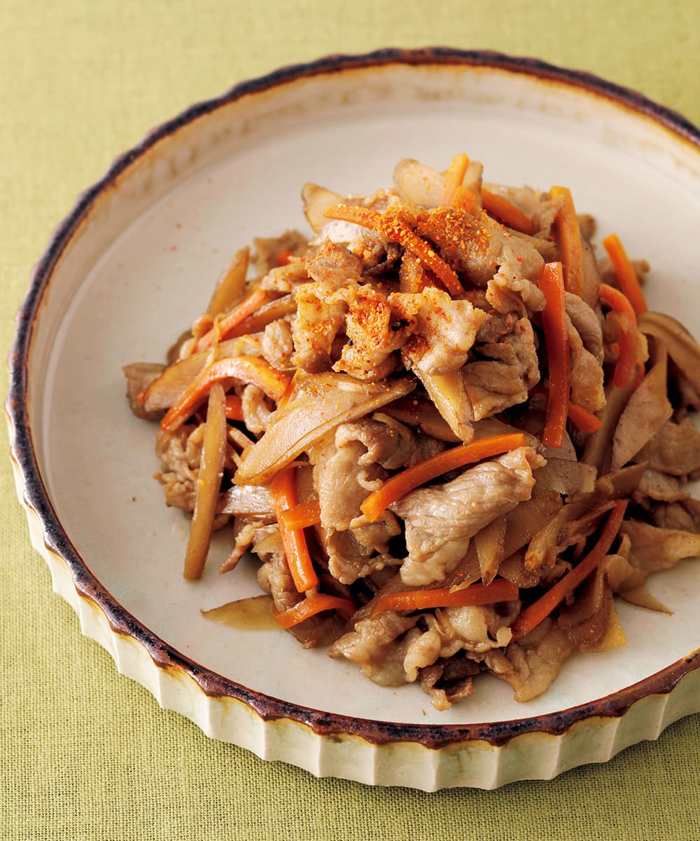 豚肉とこんにゃくごぼうの甘辛炒め。