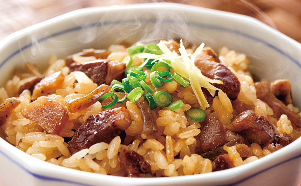 豚肉とごぼうの旨味たっぷり炊き込みご飯。