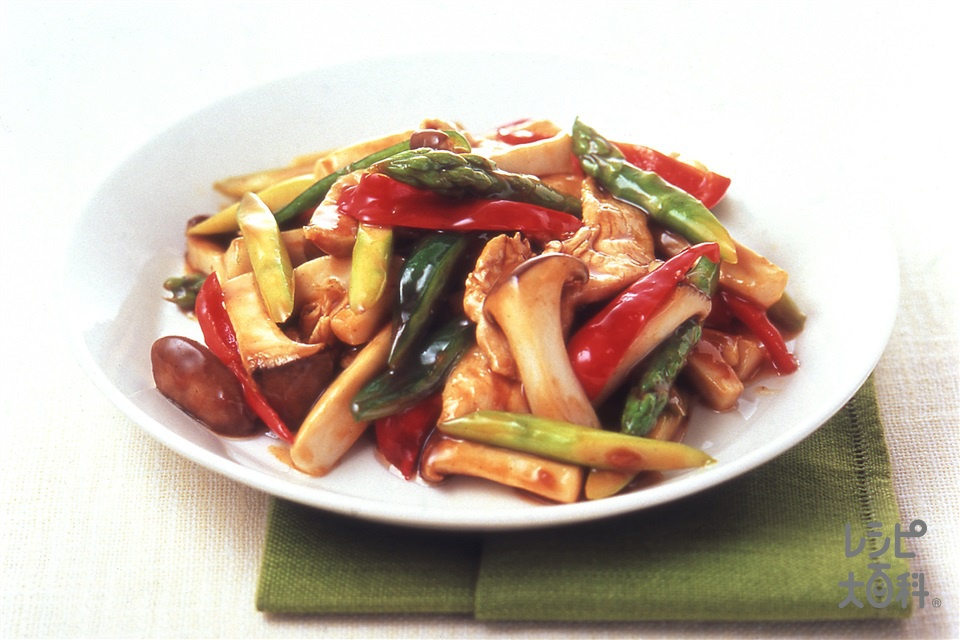 鶏肉とエリンギ、アスパラのオイスターソース炒めの献立 副菜:かぼちゃとれんこんの揚げ浸し、汁物:牛肉 とレタスの香味スープ 献立・メニュー 味の素パーク たべる楽しさを、もっと。