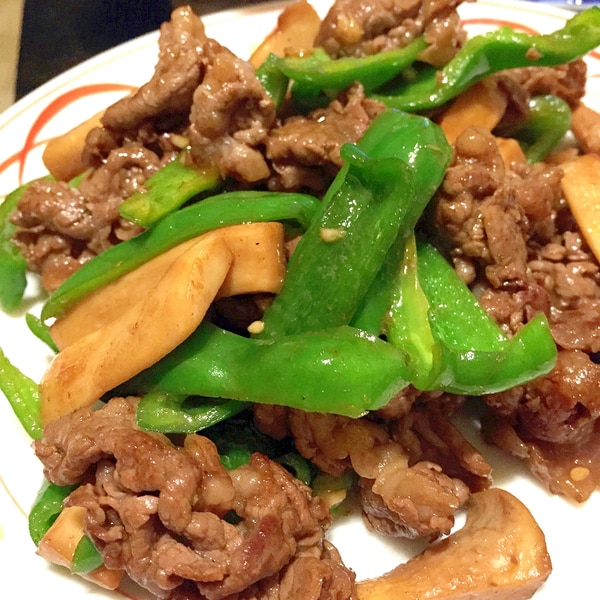 牛肉・エリンギ・ピーマンのオイスター炒め。