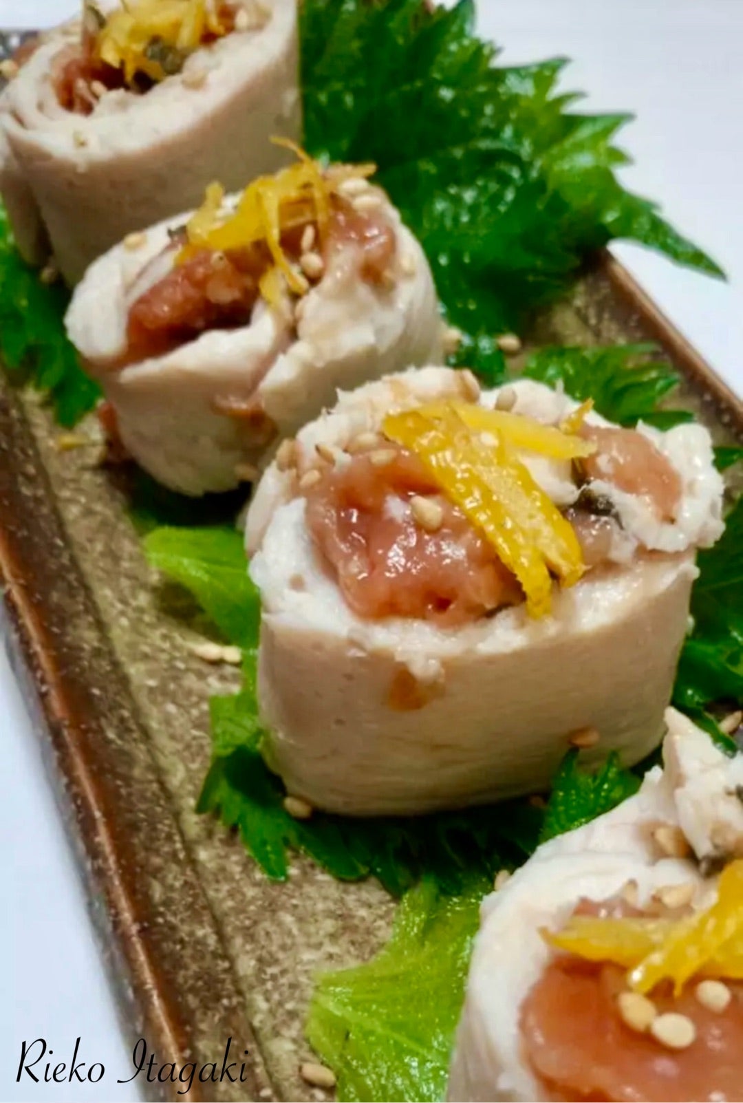 レンジで簡単!『鶏むね肉の梅しそチキンロール』バタポンソース。