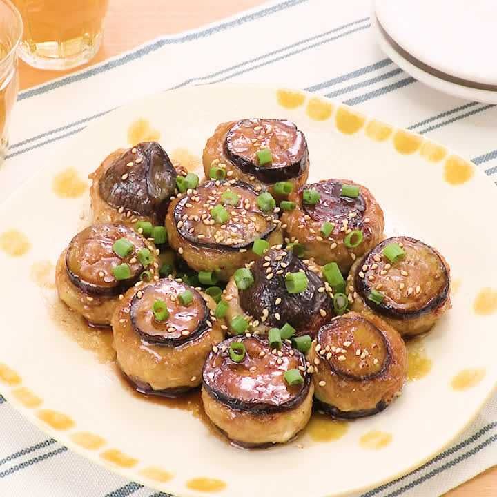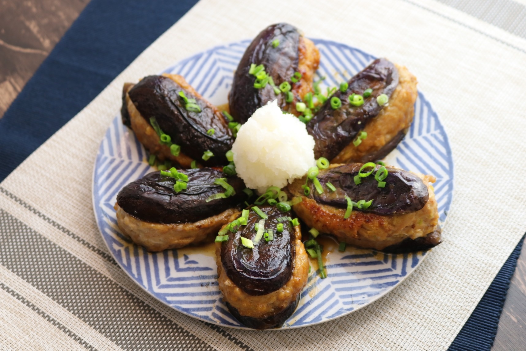つくねとジューシーななすでやみつき!まるごとなすの肉はさみ照り焼き。
