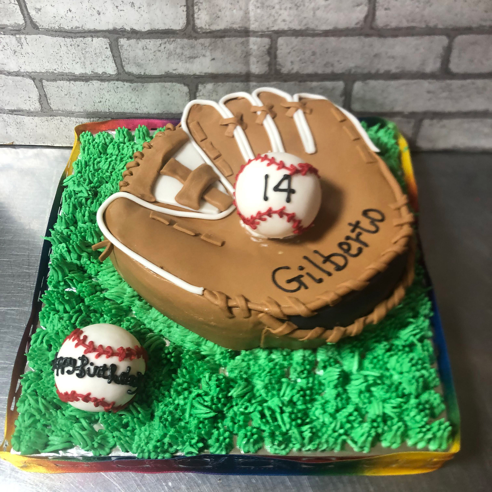 野球グローブとボールの形をしたオーダーメイドバースデーケーキデコレーションケーキのデリバリー マジックケーキデコ。