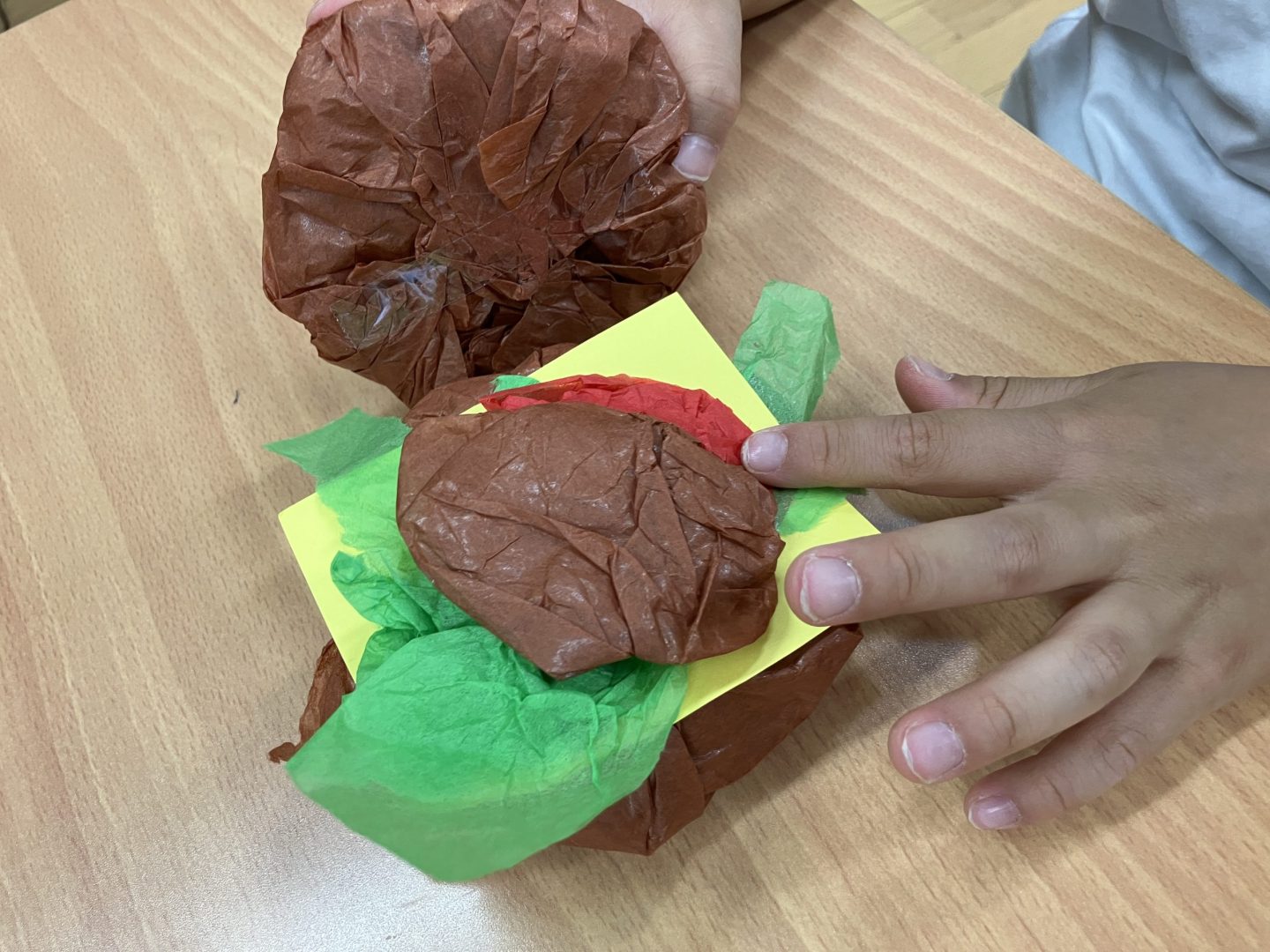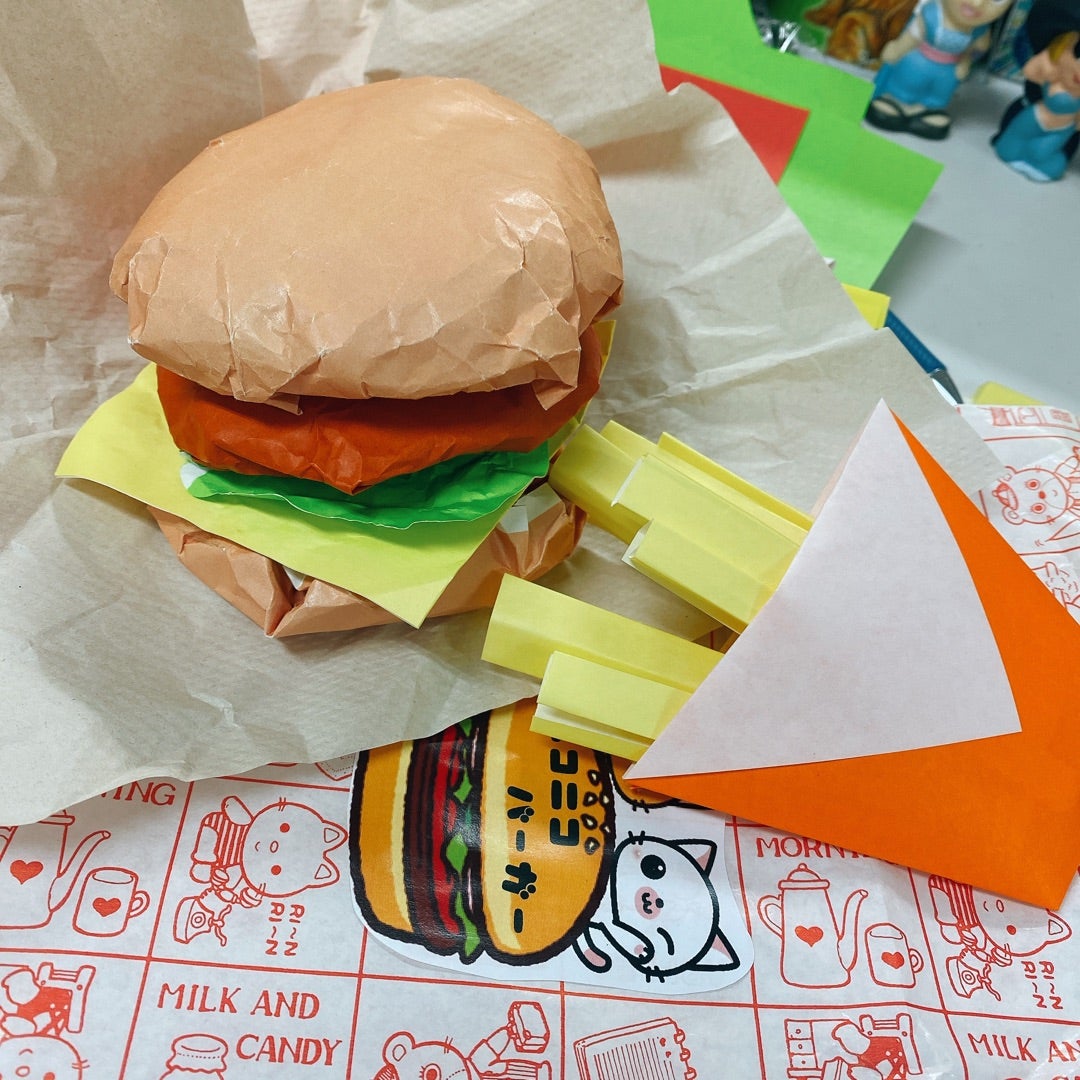 紙の緩衝材とおりがみを使ってハンバーガーをつくりました。サイドのフライドポテトもご一緒に。クラフポ。