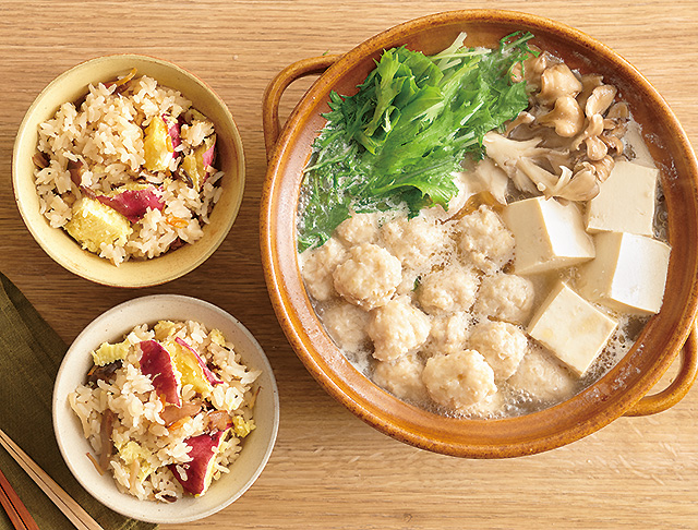 ふわふわだんごの鶏鍋、丸ごとさつま芋の松茸ごはんeフレンズ ぱくぱく献立くん。