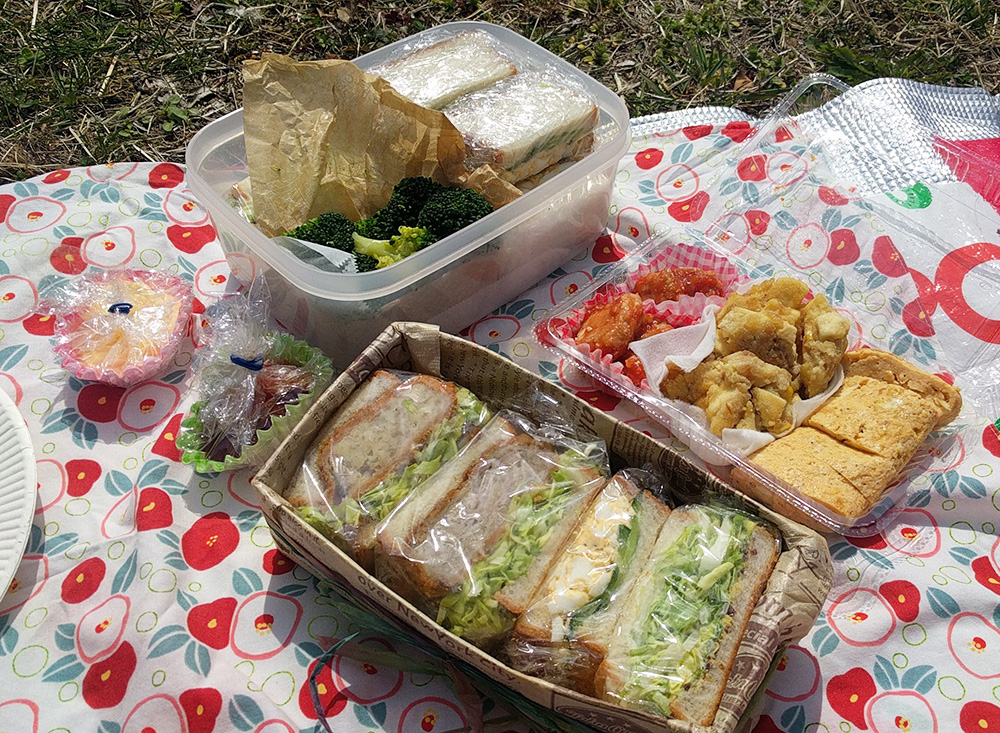 4種のサンドイッチとおかず数品。お弁当を作ってお花見へ♪。