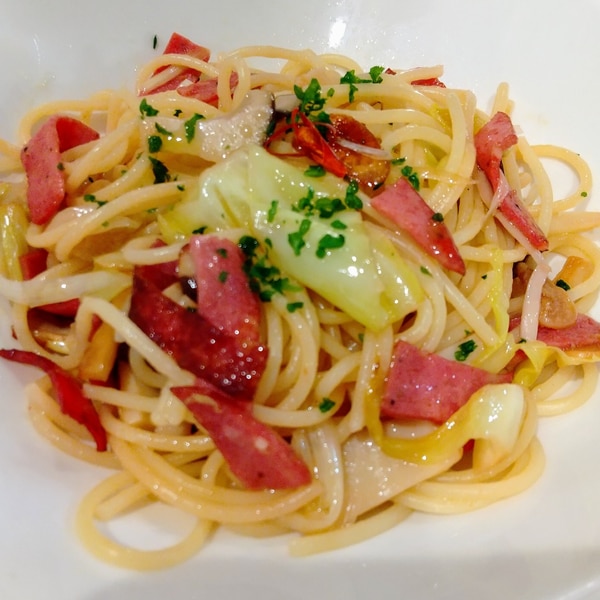 ボロニアソーセージとキャベツ入りのペペロンチーノ。