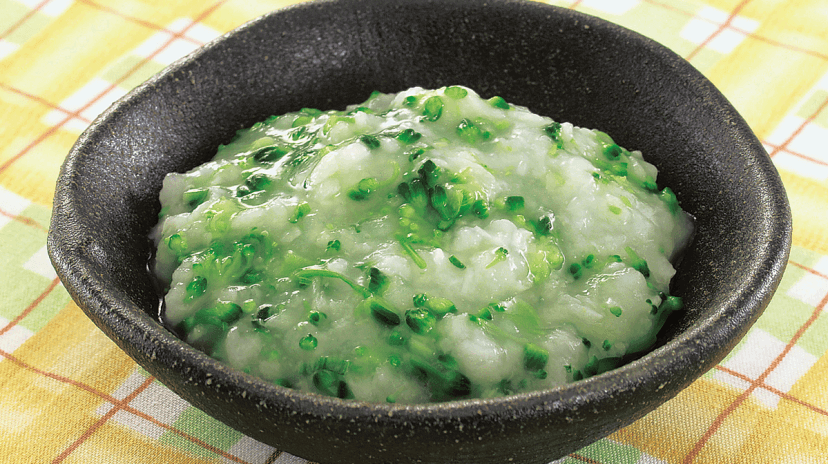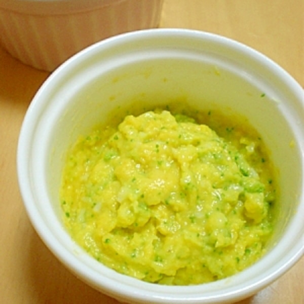 離乳食中期 ブロッコリーと玉子 黄身 のおかゆ。