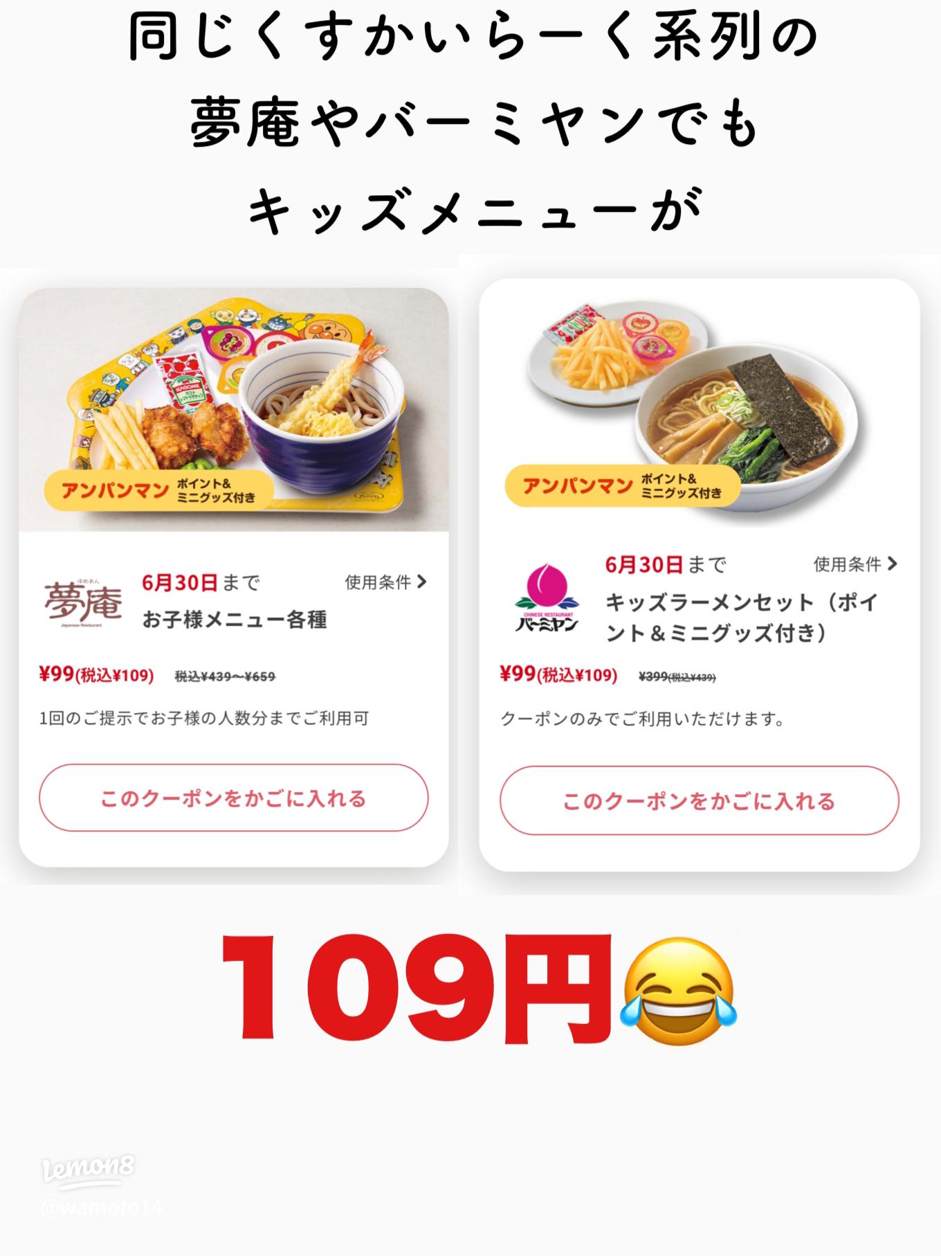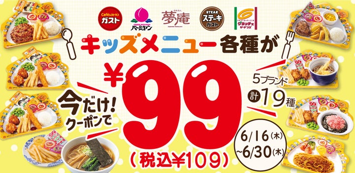 6 30まで キッズメニュー99円 税込109円 ガスト・バーミヤン・夢庵・ステーキガスト・グラッチェガーデンズマネーの達人。
