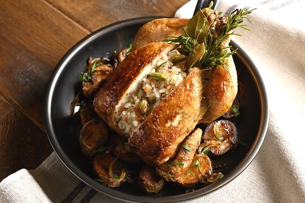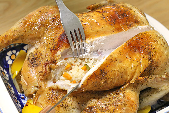 ローストチキンのレシピ丸鶏に入れるスタッフィングはお米でも。