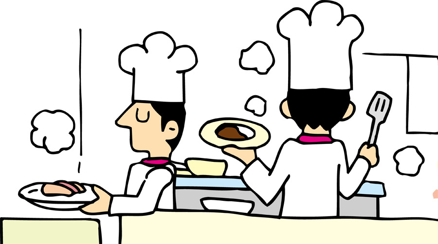 フリーイラストレストランの厨房で働くコックたちパブリックドメインQ:著作権フリー画像素材集。