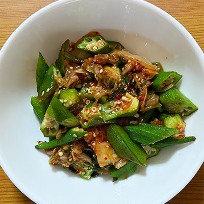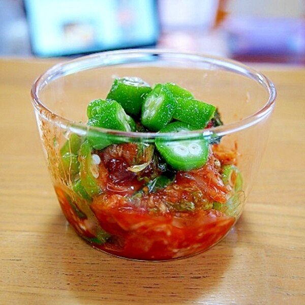 レンジで簡単「オクラのキムチツナマヨ和え」レシピ。