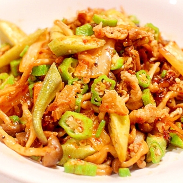 分量が簡単!労わりおかず♪オクラたっぷり豚キムチ。