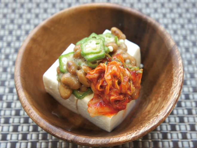 ぱぱっと副菜!オクラ納豆キムチぶっかけやっこ。