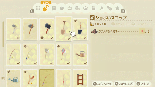 あつまれどうぶつの森:ショボくない普通の道具のレシピ入手方法 オノ、いしのオノ、ジョウロ、スコップ、つりざお、あみジョニーの漂流日誌。