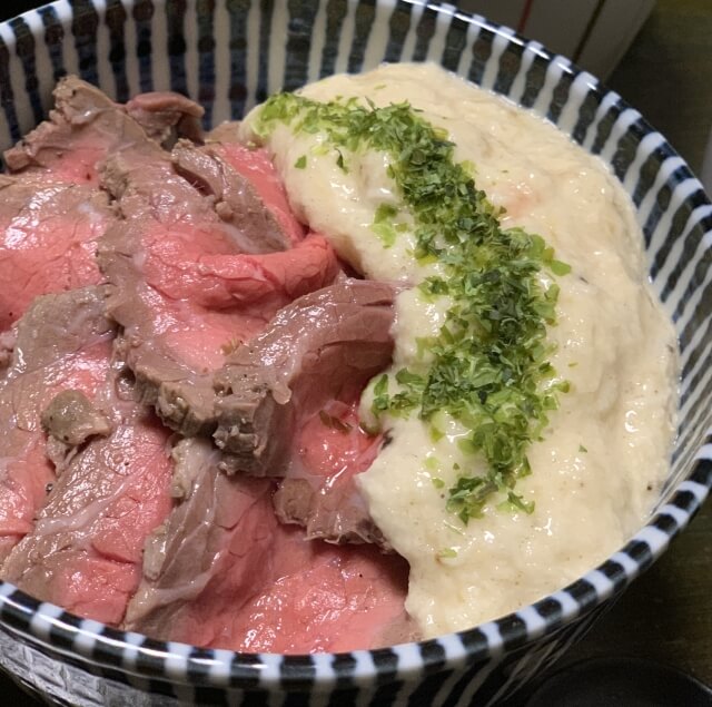 業スー食材を活用!冷凍食品レシピ ネギ塩牛たんとろろ丼。
