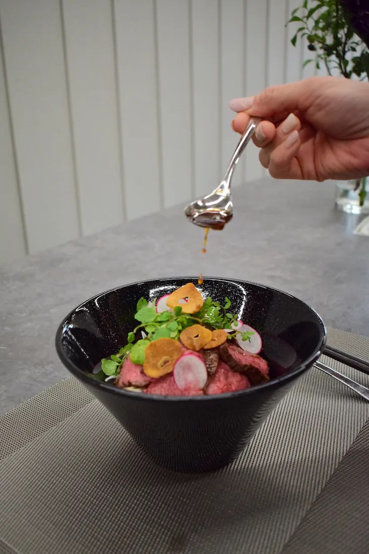 トロけるお肉♪ローストビーフ丼の盛り付け・食べ方レシピ北海道へ行こう。