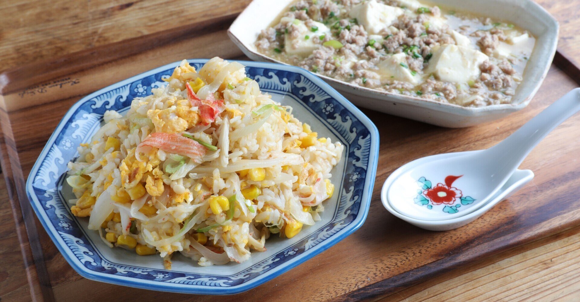 主食 カニカマとコーンのチャーハン副菜 豚ひきの和風だし麻婆 の作り方ぐっち夫婦@料理家。