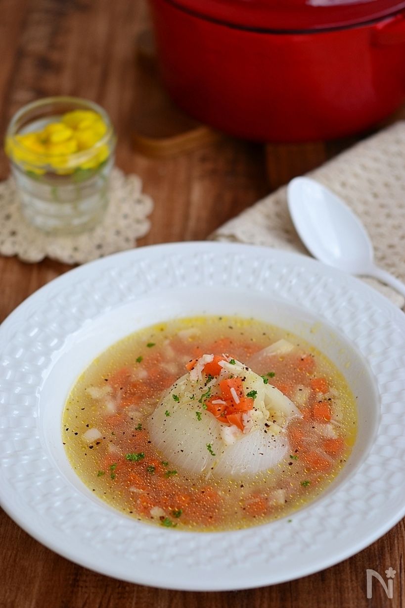 甘くてトロトロ♪ 新玉丸ごとコンソメスープ。